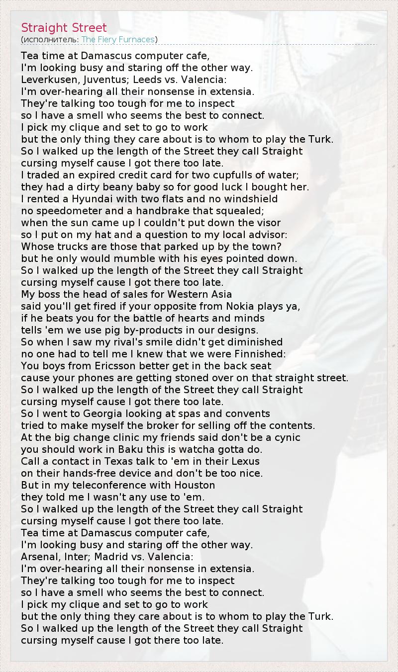 Tea time at Damascus computer cafe, I'm looking busy and staring off the other way. Leverkusen, Juventus; Leeds vs. Valencia: I'm over-hearing all their nonsense in extensia. They're talking too tough for me to inspect so I have a smell who seems the best to connect. I pick my clique and set to go to work but the only thing they care about is to whom to play the Turk. So I walked up the length of the Street they call Straight cursing myself cause I got there too late. I traded an expired credit card for two cupfulls of water; they had a dirty beany baby so for good luck I bought her. I rented a Hyundai with two flats and no windshield no speedometer and a handbrake that squealed; when the sun came up I couldn't put down the visor so I put on my hat and a question to my local advisor: Whose trucks are those that parked up by the town? but he only would mumble with his eyes pointed down. So I walked up the length of the Street they call Straight cursing myself cause I got there too late. My boss the head of sales for Western Asia said you'll get fired if your opposite from Nokia plays ya, if he beats you for the battle of hearts and minds tells 'em we use pig by-products in our designs. So when I saw my rival's smile didn't get diminished no one had to tell me I knew that we were Finnished: You boys from Ericsson better get in the back seat cause your phones are getting stoned over on that straight street. So I walked up the length of the Street they call Straight cursing myself cause I got there too late. So I went to Georgia looking at spas and convents tried to make myself the broker for selling off the contents. At the big change clinic my friends said don't be a cynic you should work in Baku this is watcha gotta do. Call a contact in Texas talk to 'em in their Lexus on their hands-free device and don't be too nice. But in my teleconference with Houston they told me I wasn't any use to 'em. So I walked up the length of the Street they call Straight cursing myself cause I got there too late. Tea time at Damascus computer cafe, I'm looking busy and staring off the other way. Arsenal, Inter; Madrid vs. Valencia: I'm over-hearing all their nonsense in extensia. They're talking too tough for me to inspect so I have a smell who seems the best to connect. I pick my clique and set to go to work but the only thing they care about is to whom to play the Turk. So I walked up the length of the Street they call Straight cursing myself cause I got there too late.