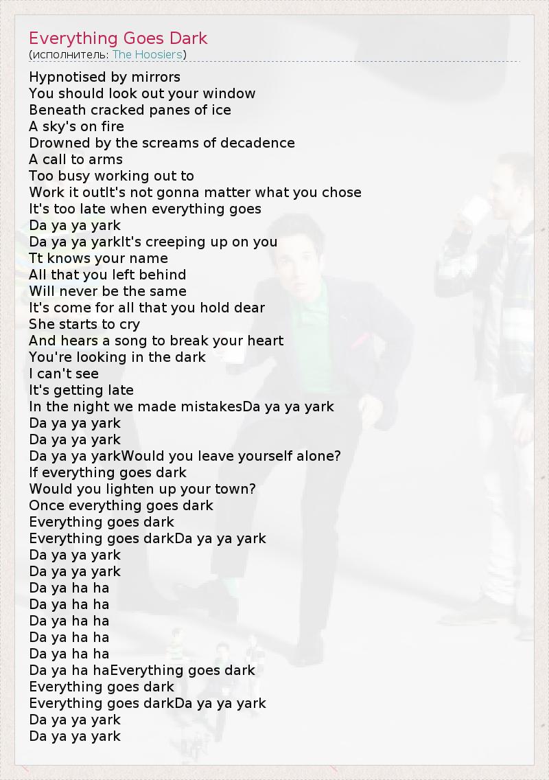 Hypnotised by mirrors You should look out your window Beneath cracked panes of ice A sky's on fire Drowned by the screams of decadence A call to arms Too busy working out to Work it outIt's not gonna matter what you chose It's too late when everything goes Da ya ya yark Da ya ya yarkIt's creeping up on you Tt knows your name All that you left behind Will never be the same It's come for all that you hold dear She starts to cry And hears a song to break your heart You're looking in the dark I can't see It's getting late In the night we made mistakesDa ya ya yark Da ya ya yark Da ya ya yark Da ya ya yarkWould you leave yourself alone? If everything goes dark Would you lighten up your town? Once everything goes dark Everything goes dark Everything goes darkDa ya ya yark Da ya ya yark Da ya ya yark Da ya ha ha Da ya ha ha Da ya ha ha Da ya ha ha Da ya ha ha Da ya ha haEverything goes dark Everything goes dark Everything goes darkDa ya ya yark Da ya ya yark Da ya ya yark