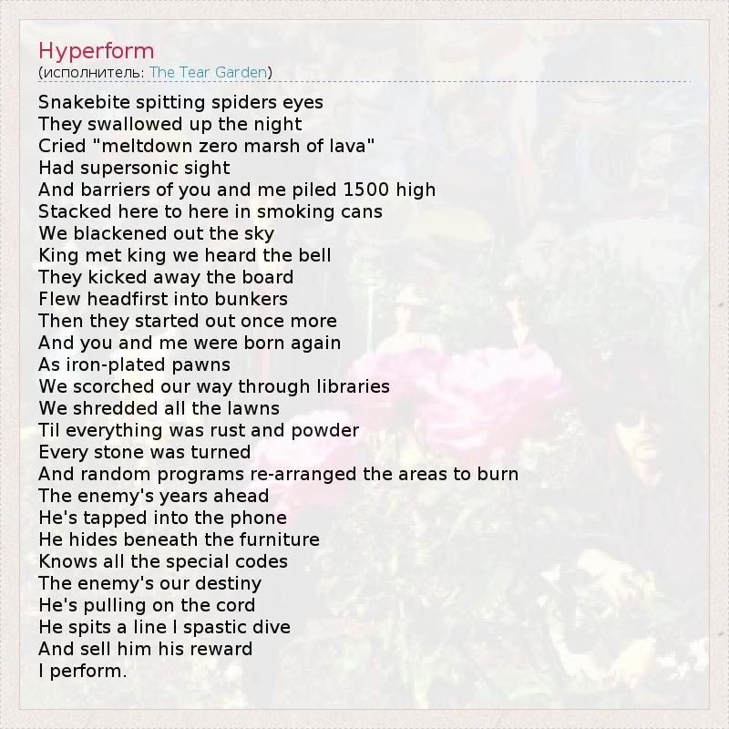Это интересно:Группа была основана в результате знакомства музыкантов The Legendary Pink Dots и Skinny Puppy, произошедшего во время совместных американских концертов в 86-м году. Дебютным релизом стал вышедший в 86-м году на Nettwerk/PIAS EP "The Tear Garden", через год полностью включенный в CD-версию альбома "Tired Eyes, Slowly Burning". Поначалу The Tear Garden представляла из себя несколько более спокойный вариант Skinny Puppy, но с вокалом Edward... продолжение