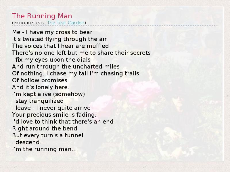 Me - I have my cross to bear It's twisted flying through the air The voices that I hear are muffled There's no-one left but me to share their secrets I fix my eyes upon the dials And run through the uncharted miles Of nothing. I chase my tail I'm chasing trails Of hollow promises And it's lonely here. I'm kept alive (somehow) I stay tranquilized I leave - I never quite arrive Your precious smile is fading. I'd love to think that there's an end Right around the bend But every turn's a tunnel. I descend. I'm the running man...