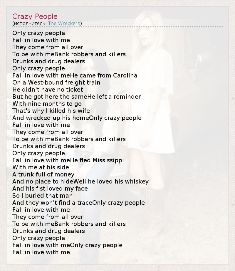 Only crazy people Fall in love with me They come from all over To be with meBank robbers and killers Drunks and drug dealers Only crazy people Fall in love with meHe came from Carolina On a West-bound freight train He didn't have no ticket But he got here the sameHe left a reminder With nine months to go That's why I killed his wife And wrecked up his homeOnly crazy people Fall in love with me They come from all over To be with meBank robbers and killers Drunks and drug dealers Only crazy people Fall in love with meHe fled Mississippi With me at his side A trunk full of money And no place to hideWell he loved his whiskey And his fist loved my face So I buried that man And they won't find a traceOnly crazy people Fall in love with me They come from all over To be with meBank robbers and killers Drunks and drug dealers Only crazy people Fall in love with meOnly crazy people Fall in love with me