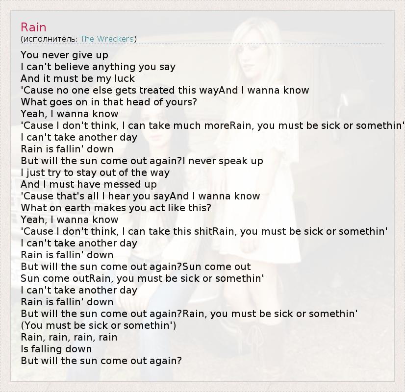 You never give up I can't believe anything you say And it must be my luck 'Cause no one else gets treated this wayAnd I wanna know What goes on in that head of yours? Yeah, I wanna know 'Cause I don't think, I can take much moreRain, you must be sick or somethin' I can't take another day Rain is fallin' down But will the sun come out again?I never speak up I just try to stay out of the way And I must have messed up 'Cause that's all I hear you sayAnd I wanna know What on earth makes you act like this? Yeah, I wanna know 'Cause I don't think, I can take this shitRain, you must be sick or somethin' I can't take another day Rain is fallin' down But will the sun come out again?Sun come out Sun come outRain, you must be sick or somethin' I can't take another day Rain is fallin' down But will the sun come out again?Rain, you must be sick or somethin' (You must be sick or somethin') Rain, rain, rain, rain Is falling down But will the sun come out again?