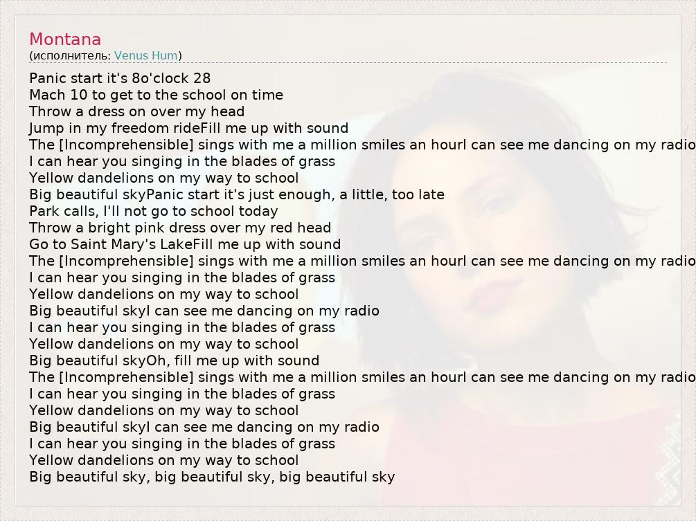 Panic start it's 8o'clock 28 Mach 10 to get to the school on time Throw a dress on over my head Jump in my freedom rideFill me up with sound The [Incomprehensible] sings with me a million smiles an hourI can see me dancing on my radio I can hear you singing in the blades of grass Yellow dandelions on my way to school Big beautiful skyPanic start it's just enough, a little, too late Park calls, I'll not go to school today Throw a bright pink dress over my red head Go to Saint Mary's LakeFill me up with sound The [Incomprehensible] sings with me a million smiles an hourI can see me dancing on my radio I can hear you singing in the blades of grass Yellow dandelions on my way to school Big beautiful skyI can see me dancing on my radio I can hear you singing in the blades of grass Yellow dandelions on my way to school Big beautiful skyOh, fill me up with sound The [Incomprehensible] sings with me a million smiles an hourI can see me dancing on my radio I can hear you singing in the blades of grass Yellow dandelions on my way to school Big beautiful skyI can see me dancing on my radio I can hear you singing in the blades of grass Yellow dandelions on my way to school Big beautiful sky, big beautiful sky, big beautiful sky