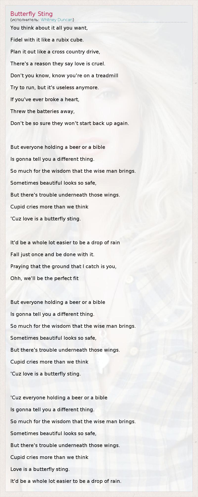 You think about it all you want, Fidel with it like a rubix cube. Plan it out like a cross country drive, There's a reason they say love is cruel. Don't you know, know you're on a treadmill Try to run, but it's useless anymore. If you've ever broke a heart, Threw the batteries away, Don't be so sure they won't start back up again. But everyone holding a beer or a bible Is gonna tell you a different thing. So much for the wisdom that the wise man brings. Sometimes beautiful looks so safe, But there's trouble underneath those wings. Cupid cries more than we think 'Cuz love is a butterfly sting. It'd be a whole lot easier to be a drop of rain Fall just once and be done with it. Praying that the ground that I catch is you, Ohh, we'll be the perfect fit But everyone holding a beer or a bible Is gonna tell you a different thing. So much for the wisdom that the wise man brings. Sometimes beautiful looks so safe, But there's trouble underneath those wings. Cupid cries more than we think 'Cuz love is a butterfly sting. 'Cuz everyone holding a beer or a bible Is gonna tell you a different thing. So much for the wisdom that the wise man brings. Sometimes beautiful looks so safe, But there's trouble underneath those wings. Cupid cries more than we think Love is a butterfly sting. It'd be a whole lot easier to be a drop of rain.