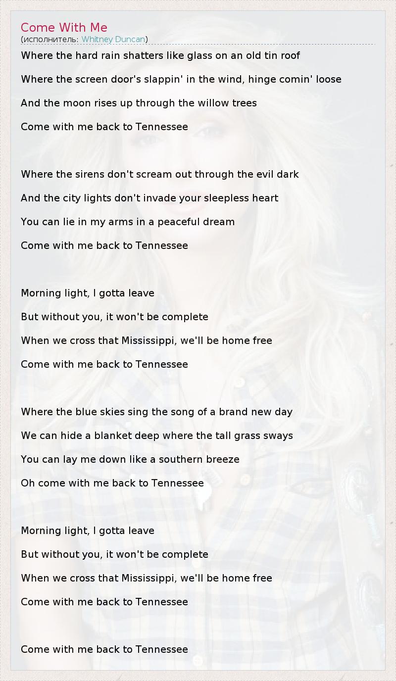 Where the hard rain shatters like glass on an old tin roof Where the screen door's slappin' in the wind, hinge comin' loose And the moon rises up through the willow trees Come with me back to Tennessee Where the sirens don't scream out through the evil dark And the city lights don't invade your sleepless heart You can lie in my arms in a peaceful dream Come with me back to Tennessee Morning light, I gotta leave But without you, it won't be complete When we cross that Mississippi, we'll be home free Come with me back to Tennessee Where the blue skies sing the song of a brand new day We can hide a blanket deep where the tall grass sways You can lay me down like a southern breeze Oh come with me back to Tennessee Morning light, I gotta leave But without you, it won't be complete When we cross that Mississippi, we'll be home free Come with me back to Tennessee Come with me back to Tennessee