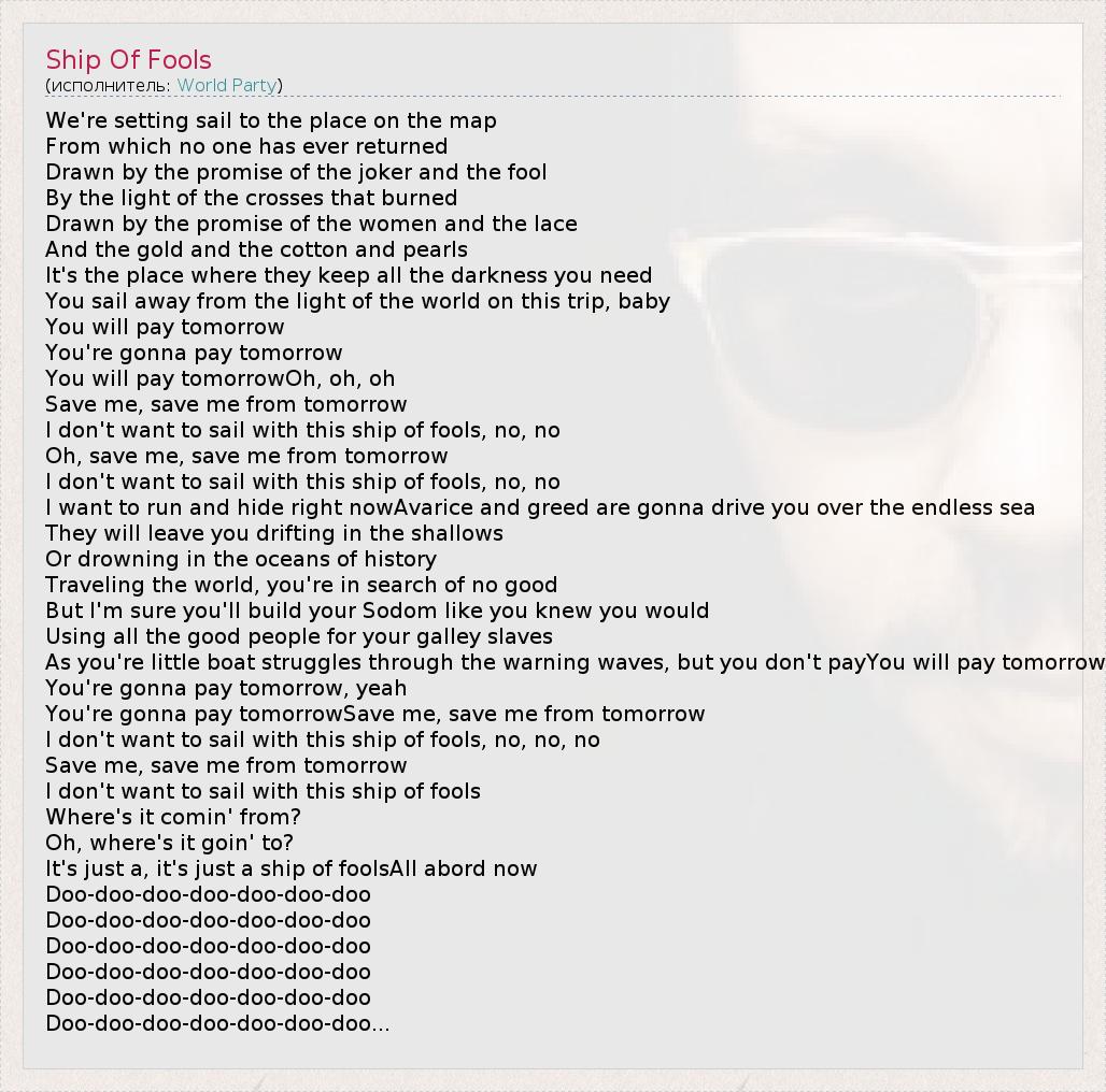 We're setting sail to the place on the map From which no one has ever returned Drawn by the promise of the joker and the fool By the light of the crosses that burned Drawn by the promise of the women and the lace And the gold and the cotton and pearls It's the place where they keep all the darkness you need You sail away from the light of the world on this trip, baby You will pay tomorrow You're gonna pay tomorrow You will pay tomorrowOh, oh, oh Save me, save me from tomorrow I don't want to sail with this ship of fools, no, no Oh, save me, save me from tomorrow I don't want to sail with this ship of fools, no, no I want to run and hide right nowAvarice and greed are gonna drive you over the endless sea They will leave you drifting in the shallows Or drowning in the oceans of history Traveling the world, you're in search of no good But I'm sure you'll build your Sodom like you knew you would Using all the good people for your galley slaves As you're little boat struggles through the warning waves, but you don't payYou will pay tomorrow You're gonna pay tomorrow, yeah You're gonna pay tomorrowSave me, save me from tomorrow I don't want to sail with this ship of fools, no, no, no Save me, save me from tomorrow I don't want to sail with this ship of fools Where's it comin' from? Oh, where's it goin' to? It's just a, it's just a ship of foolsAll abord now Doo-doo-doo-doo-doo-doo-doo Doo-doo-doo-doo-doo-doo-doo Doo-doo-doo-doo-doo-doo-doo Doo-doo-doo-doo-doo-doo-doo Doo-doo-doo-doo-doo-doo-doo Doo-doo-doo-doo-doo-doo-doo...