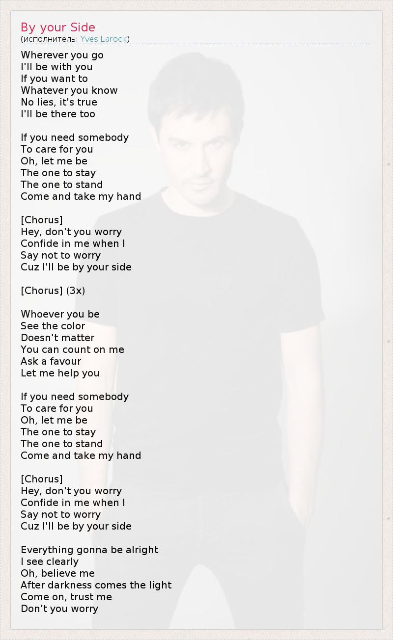 Wherever you go I'll be with you If you want to Whatever you know No lies, it's true I'll be there too If you need somebody To care for you Oh, let me be The one to stay The one to stand Come and take my hand [Chorus] Hey, don't you worry Confide in me when I Say not to worry Cuz I'll be by your side [Chorus] (3x) Whoever you be See the color Doesn't matter You can count on me Ask a favour Let me help you If you need somebody To care for you Oh, let me be The one to stay The one to stand Come and take my hand [Chorus] Hey, don't you worry Confide in me when I Say not to worry Cuz I'll be by your side Everything gonna be alright I see clearly Oh, believe me After darkness comes the light Come on, trust me Don't you worry