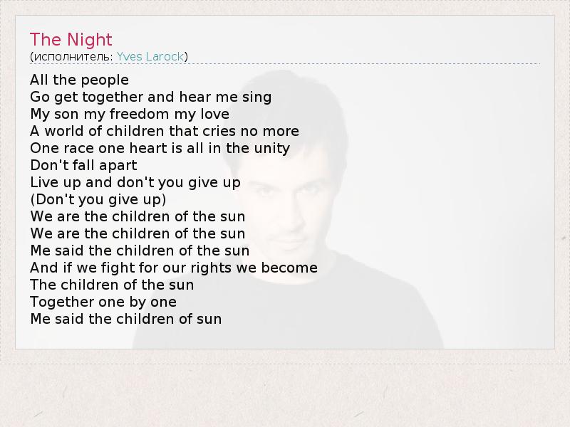 Люди, Соберитесь вместе и слушайте, что я пою. Мой сын, моя свобода, моя любовь, Мир детей, которые больше не будут плакать. Одна раса, одно сердце в единстве, Что не развалится на части. Живи достойно, не опускай руки, (Не сдавайся) Мы – дети солнца, Мы – дети солнца, Я сказал – дети солнца. И если мы боремся за свои права, мы становимся Детьми солнца. Вместе, друг за другом, Я сказал – дети солнца.