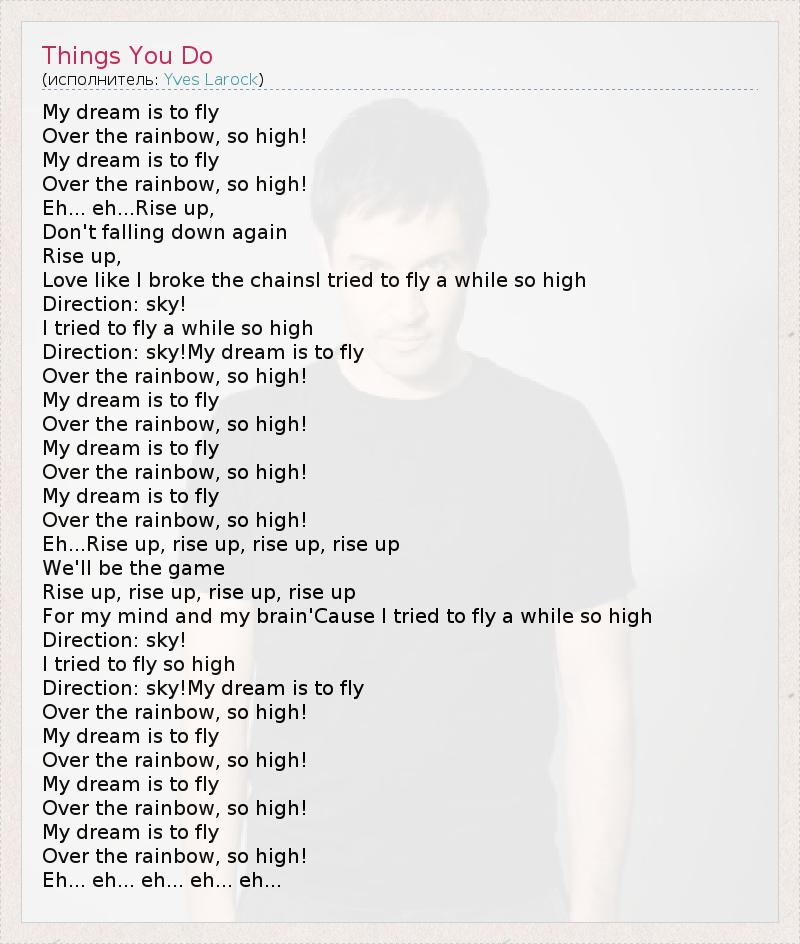 My dream is to fly Over the rainbow, so high! My dream is to fly Over the rainbow, so high! Eh... eh...Rise up, Don't falling down again Rise up, Love like I broke the chainsI tried to fly a while so high Direction: sky! I tried to fly a while so high Direction: sky!My dream is to fly Over the rainbow, so high! My dream is to fly Over the rainbow, so high! My dream is to fly Over the rainbow, so high! My dream is to fly Over the rainbow, so high! Eh...Rise up, rise up, rise up, rise up We'll be the game Rise up, rise up, rise up, rise up For my mind and my brain'Cause I tried to fly a while so high Direction: sky! I tried to fly so high Direction: sky!My dream is to fly Over the rainbow, so high! My dream is to fly Over the rainbow, so high! My dream is to fly Over the rainbow, so high! My dream is to fly Over the rainbow, so high! Eh... eh... eh... eh... eh...