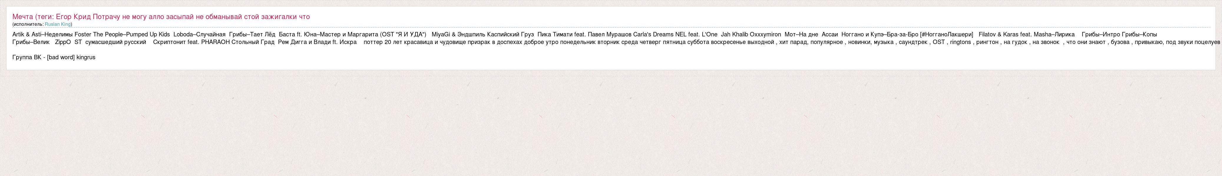 Главная→Исполнители→Ruslan King→Мечта (теги: Егор Крид Потрачу не могу алло засыпай не обманывай стой зажигал