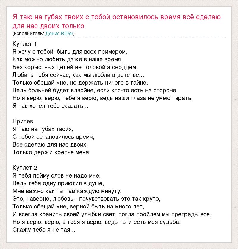 Куплет 1 Я хочу с тобой, быть для всех примером, Как можно любить даже в наше время, Без корыстных целей не головой а сердцем, Любить тебя сейчас, как мы любли в детстве... Только обещай мне, не держать ничего в тайне, Ведь больней будет вдвойне, если кто-то есть на стороне Но я верю, верю, тебе я верю, ведь наши глаза не умеют врать, Я так хотел тебе сказать... Припев Я таю на губах твоих, С тобой остановилось время, Все сделаю для нас двоих, Только держи крепче меня Куплет 2 Я тебя пойму слов не надо мне, Ведь тебя одну приютил в душе, Мне важно как ты там каждую минуту, Это, наверно, любовь - почувствовать это так круто, Только обещай мне, верной быть на много лет, И всегда хранить своей улыбки свет, тогда пройдем мы преграды все, Но я верю, верю, в тебя я верю, ведь ты и есть моя судьба, Скажу тебе я не тая...